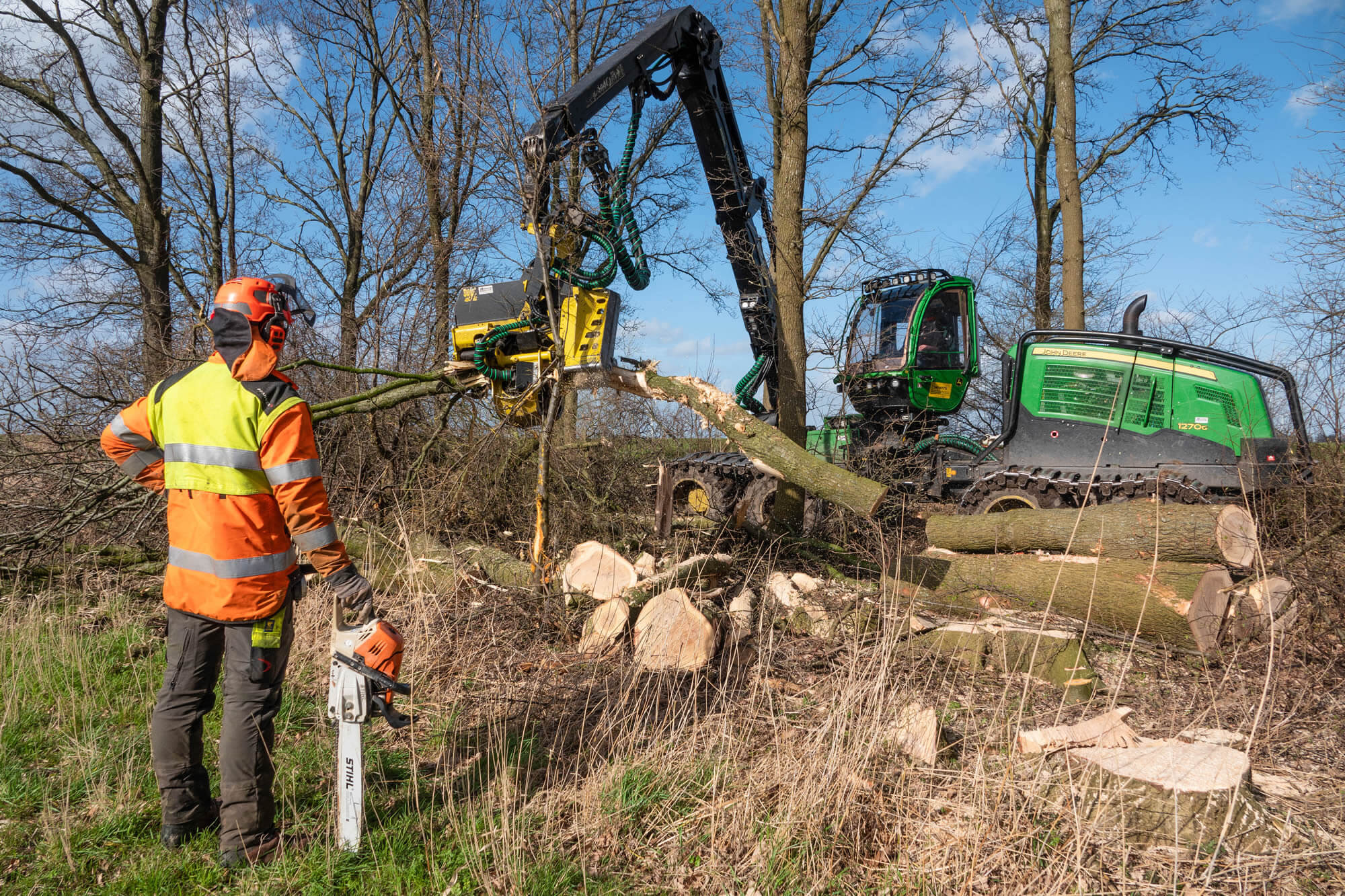 Bij zware bomen en zogenaamde kantbomen wordt er een man met motorzaag ingezet om de harvester machinist te assisteren.