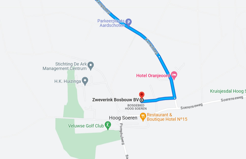 Plan uw route naar ons kantoor door te klikken op het routekaartje. Wij adviseren u om Hoog Soeren binnen te rijden via de Kampsteeg, zoals op het kaartje weergegeven.